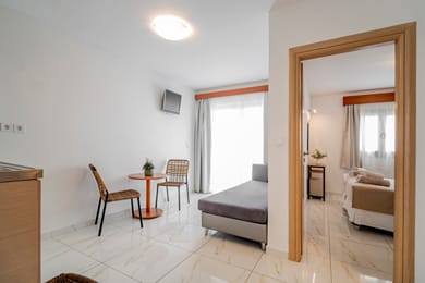 Comfortable homely apartments with either a separate bedroom or open plan and a seating-dining area with kitchen facilities with a balcony or terrace, Flat screen TV with Satellite Channels, bathroom with either bathtub or shower, air-conditioning unit, safe deposit box (extra cost), hairdryer, mini fridge, direct dial telephone, free Wi-Fi access, en suite amenities, pool towels & tea facilities.