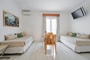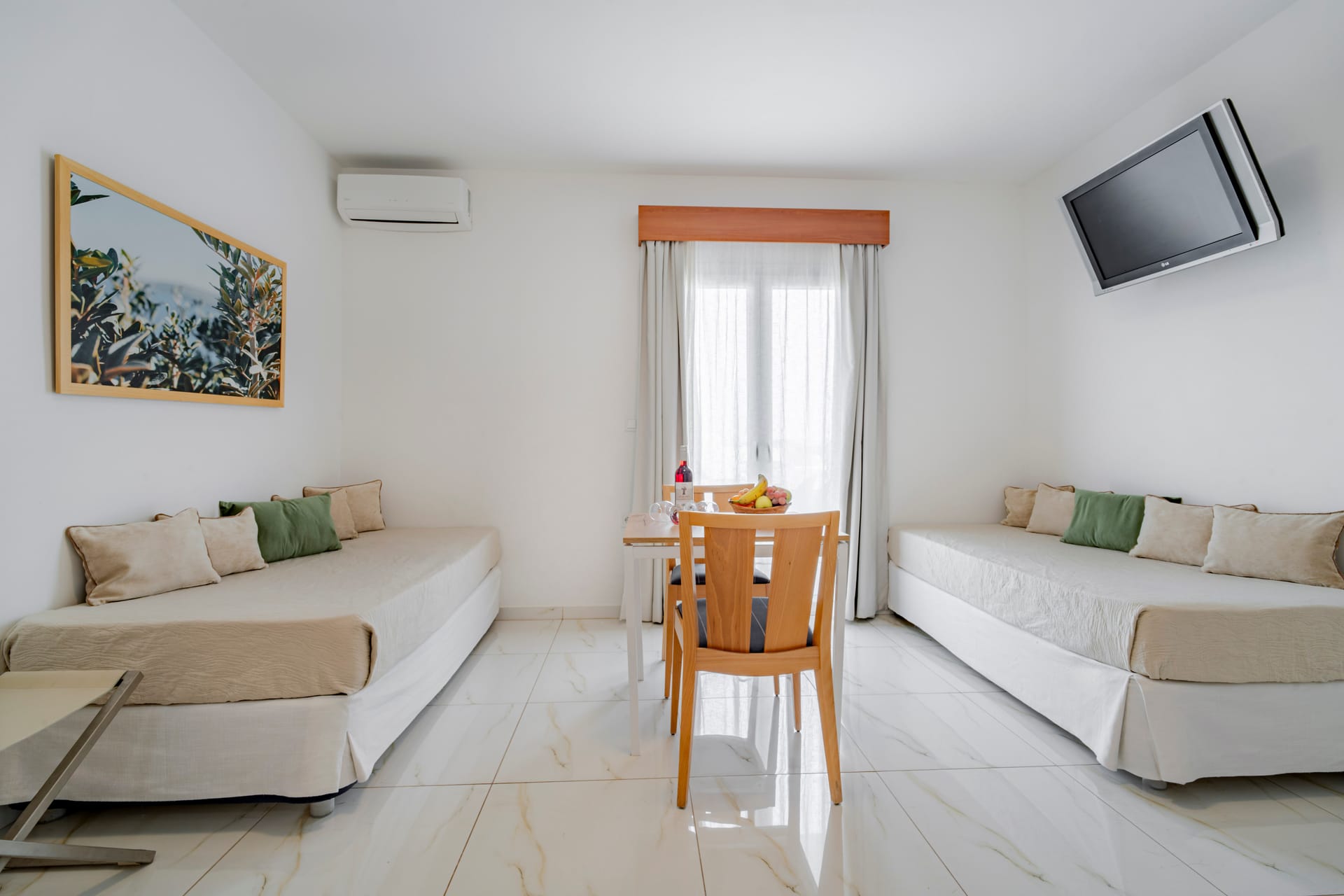 Spacious comfortable apartments with two separate bedrooms and a spacious seating-dining area with sofa bed or beds with kitchen facilities with a terrace or balcony, Flat screen TV with Satellite Channels, bathroom with either bathtub or shower, air-conditioning unit, safe deposit box(extra cost), hairdryer, mini fridge, direct dial telephone , free Wi-Fi access, en suite amenities, pool towels & tea facilities.